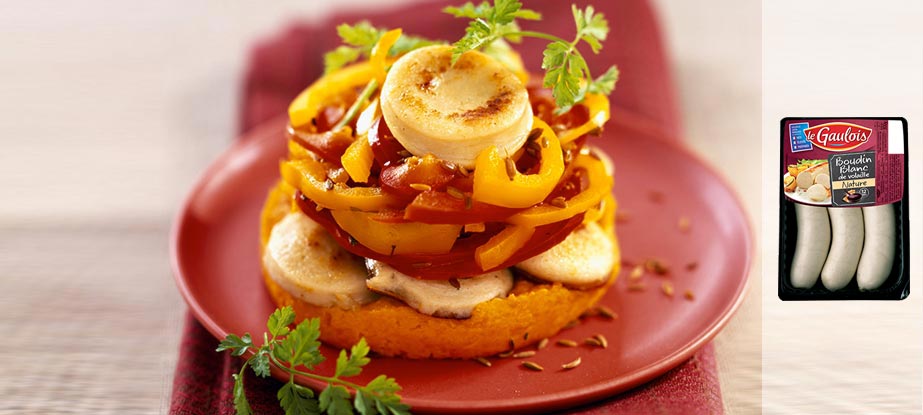 - Pour monter vos timbales, servez-vous d’un cercle. Dans l’ordre, commencez par disposer la purée de carotte, recouvrez de lamelles de boudin puis de poivron, préalablement égoutté. Vous pouvez effectuer cette opération plusieurs fois.